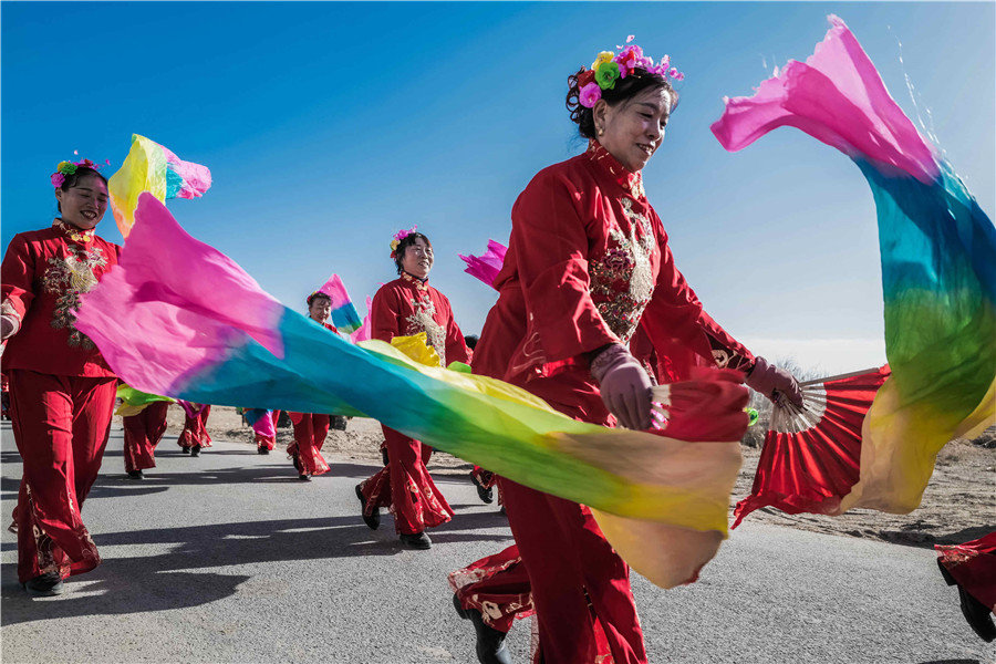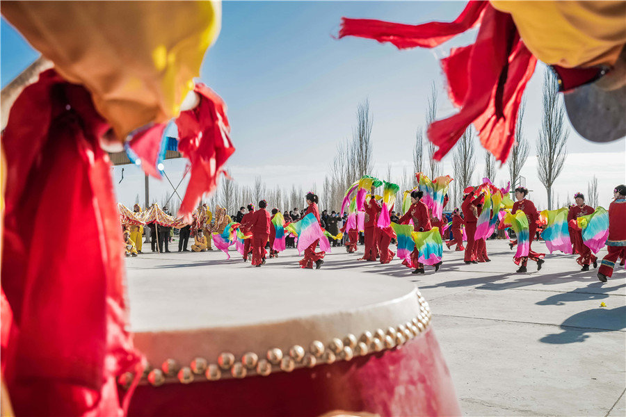 元宵佳节即将到来,敦煌市民间艺人在乡村进行舞龙、太平鼓、跑驴、划旱船、迎新娘等传统社火节目表演,与市民一起闹春迎元宵。