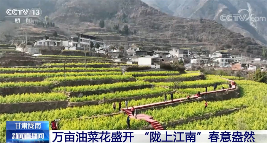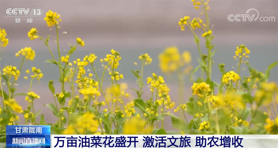 总台记者 项思:这里是甘肃省陇南市文县,位于甘肃的最南端,也是甘肃最早迎来春天的地方。一江碧水、两岸青山,大面积盛开的油菜花迎着和煦的春风泛起金色的波浪,一股浓烈的春天气息扑面而来。从春节前10天左右,这里的万亩油菜花就陆续开放了。如今步入春天,油菜花已进入盛花期。文县接壤四川,嘉陵江的上游白龙江穿越境内,气候温暖潮湿,具有夏无酷暑、冬无严寒的气候特点,被称为“陇上江南”。