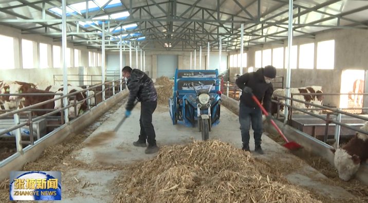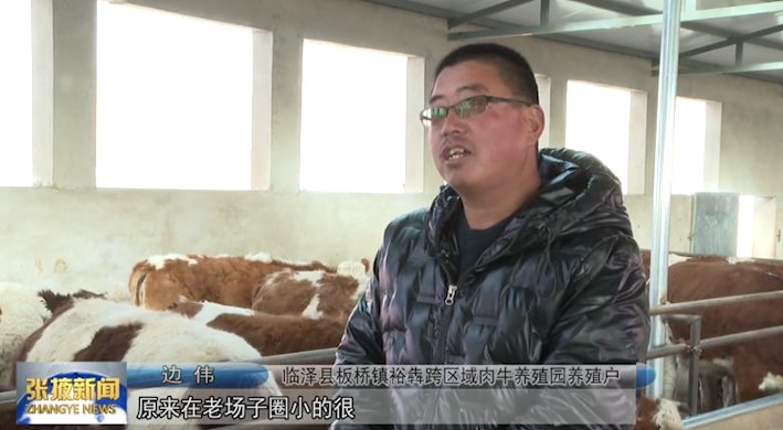 临泽县板桥镇裕犇跨区域肉牛养殖园养殖户边伟:“原来在老场子,老场子圈小的很,喂起来太麻烦,喂一回都得两三个小时。现在搬到这个新牛场,喂起来太方便,装载机草倒过来,两个边里一添,料一撒,清粪也比原来方便多。”