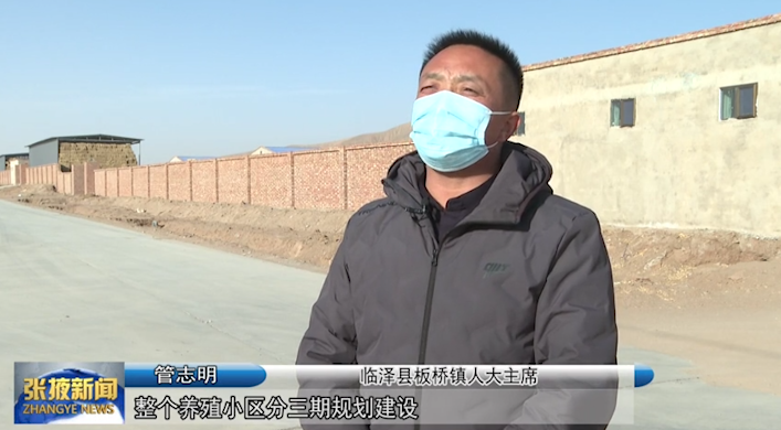 临泽县板桥镇人大主席管志明 :“整个养殖小区分三期规划建设,今年完成第一期建设,占地100亩,目前,已修建牛舍16栋,计划养牛达到3000头,整个园区三期建成后可达到万头规模。”