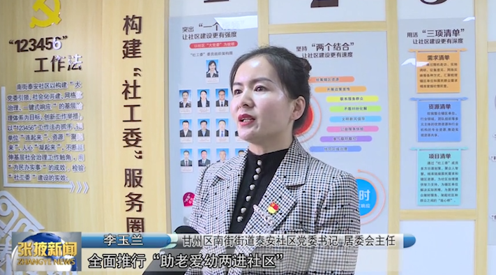 甘州区南街街道泰安社区党委书记、居委会主任李玉兰:“全面推行‘助老爱幼两进社区’,真正实现老有颐养、幼有善育,营造和谐幸福的社会氛围。”