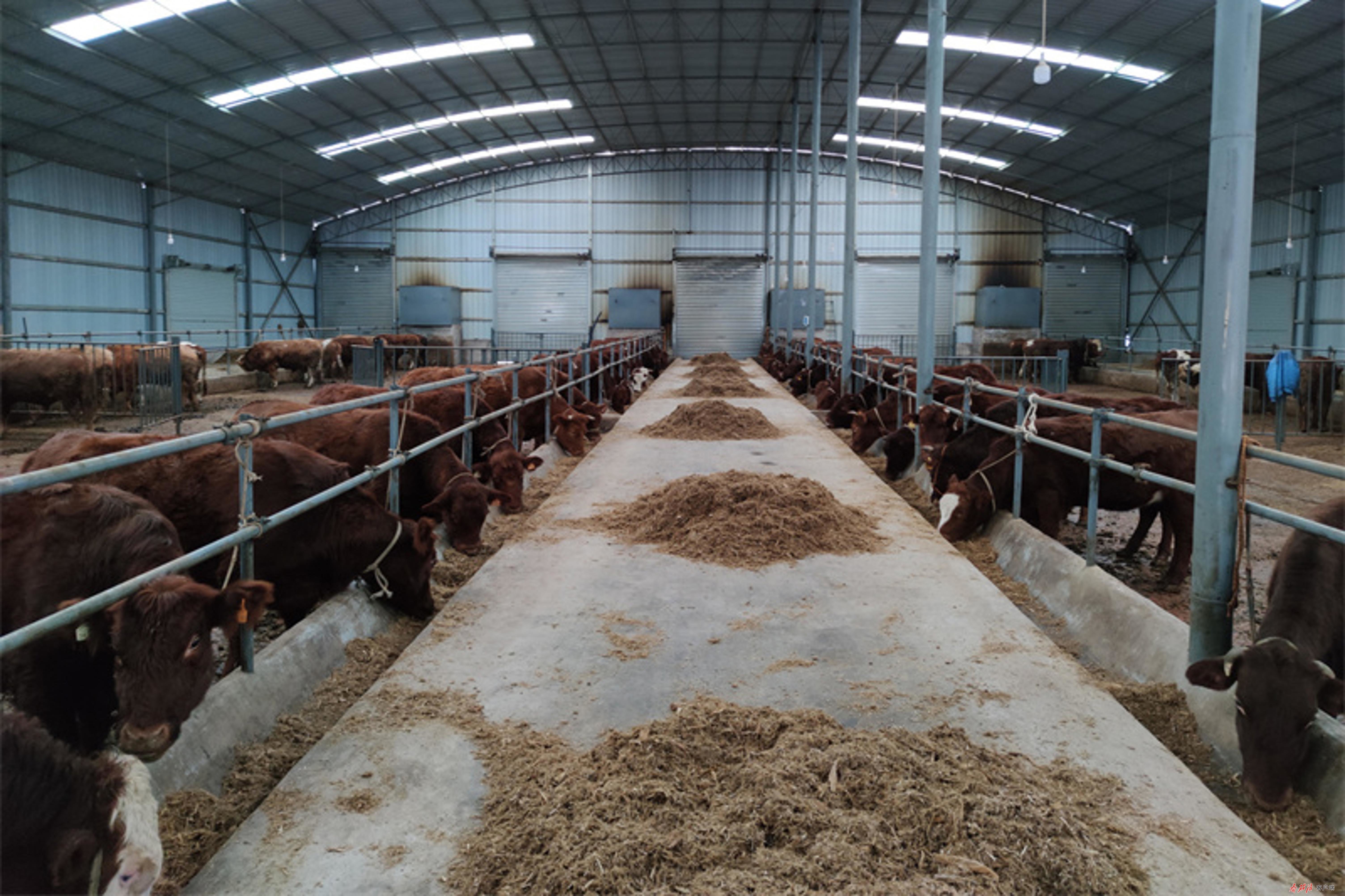 在永宁镇河湾村平凉红牛集散中心交易大棚内,待出售的红牛个个膘肥体壮,工人正将加工好的饲料一车车送进牛棚。