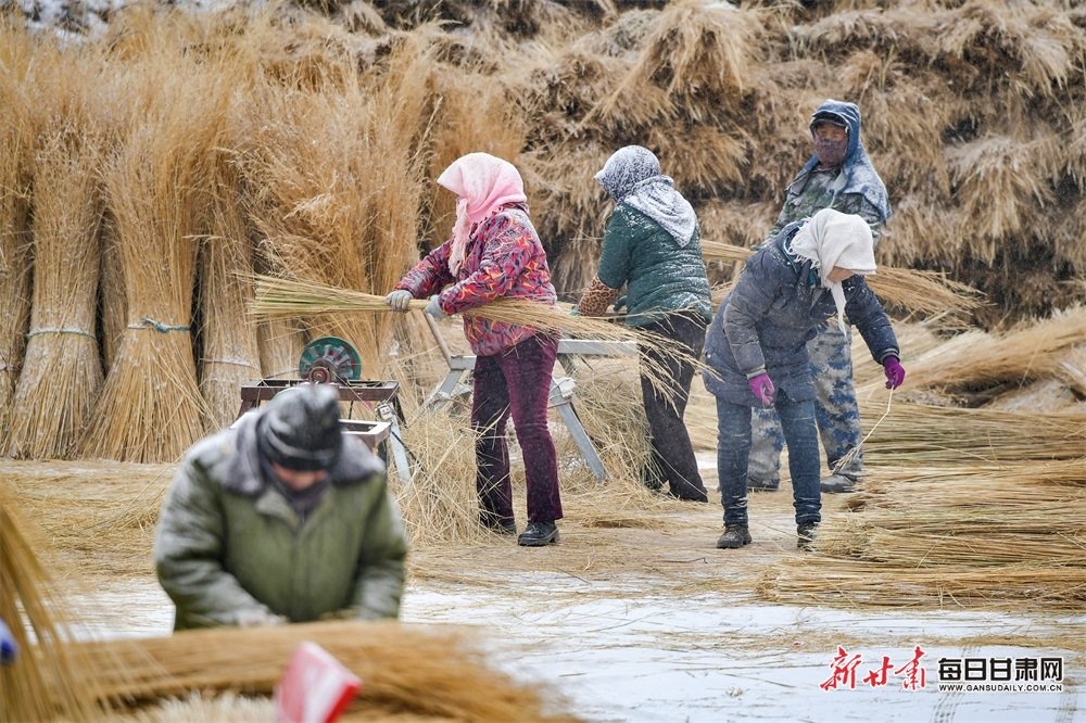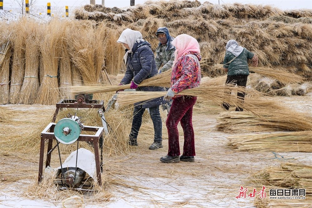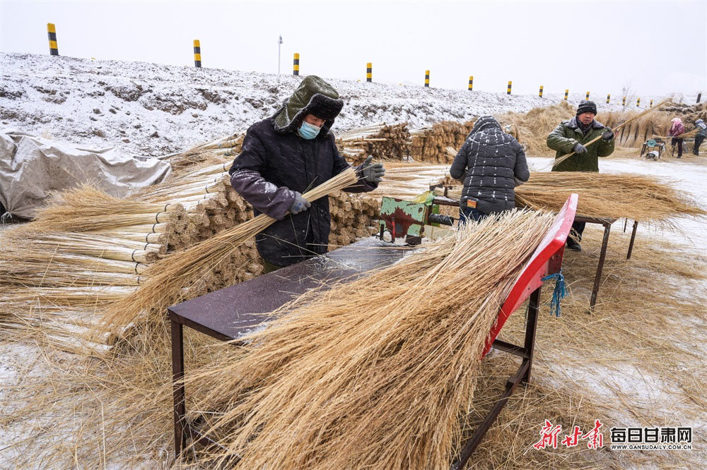 2月12日,在位于民乐县永固镇东街村芨芨草加工厂的生产车间里,工人们正忙着赶制芨芨草扫帚,去除杂叶、整理填圈、钉入手把、机器扣压、整形打包,各道工序有条不紊。