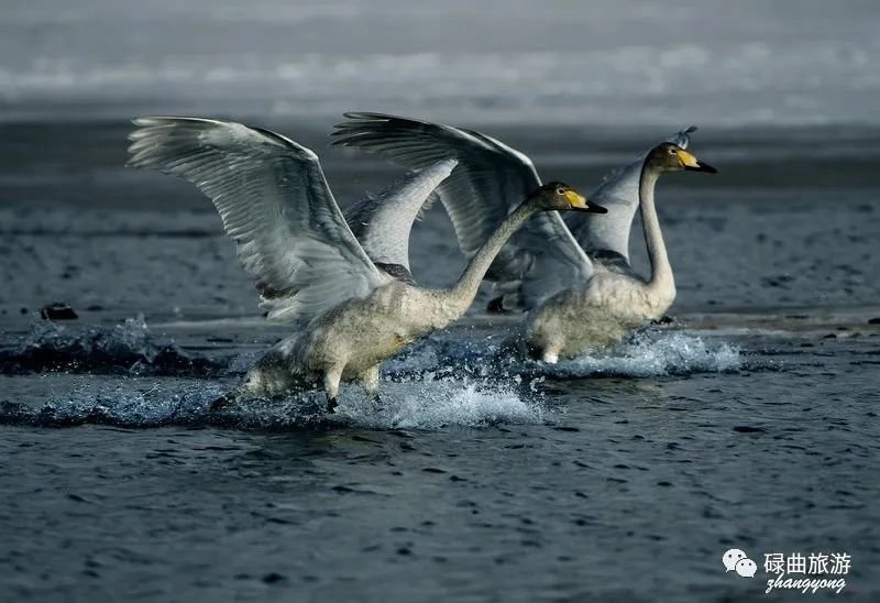 白天鹅、灰雁、斑头雁、棕头鸥、黑颈鹤栖于河畔,