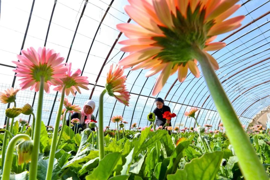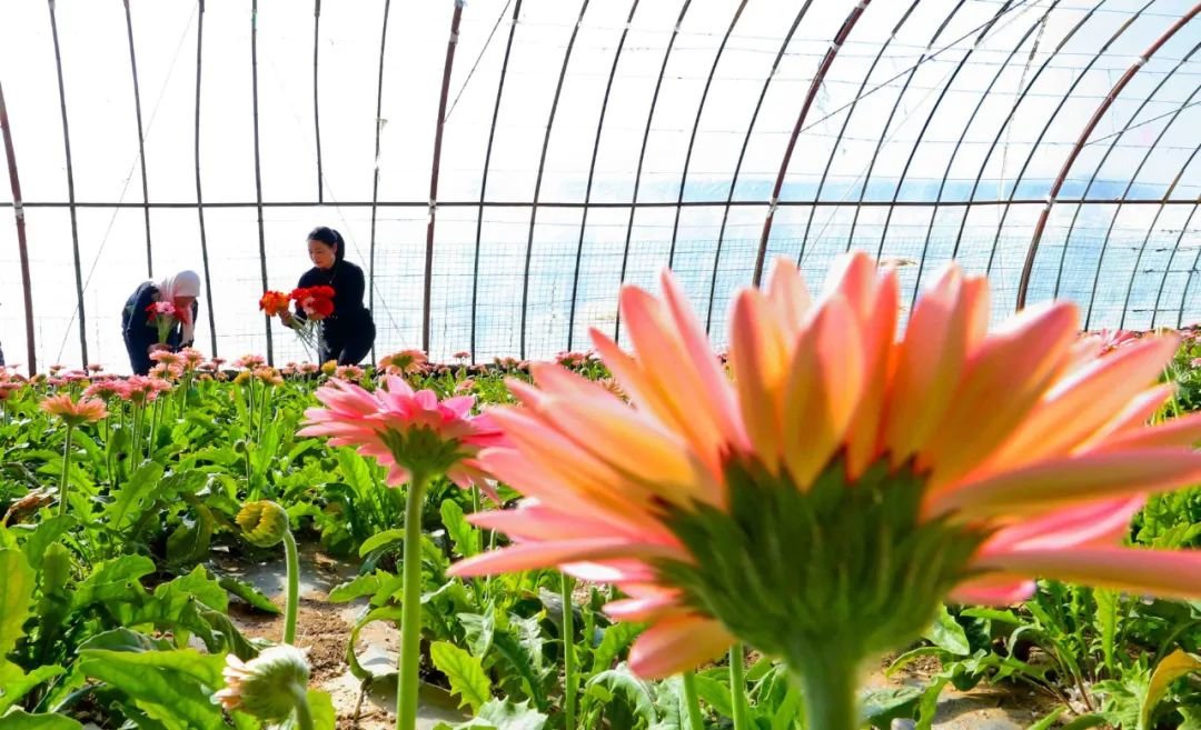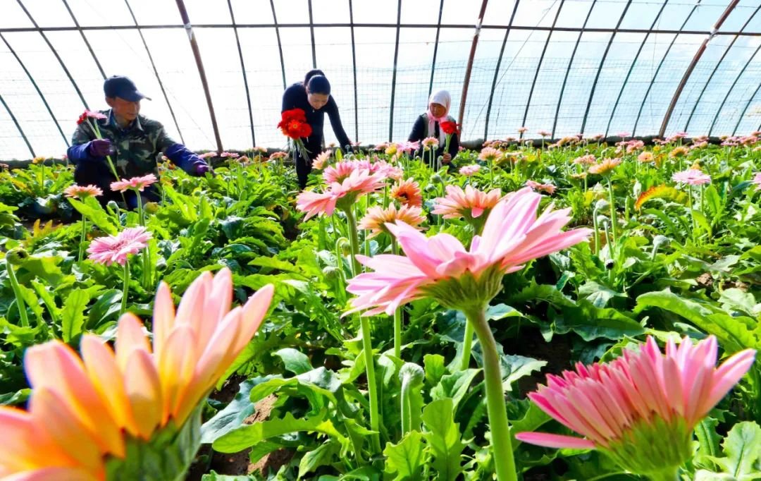 3月6日,临泽县倪家营镇梨园村鲜切花种植基地大棚内,一朵朵鲜艳饱满的非洲菊竞相绽放、满目缤纷,花农们正忙着采摘盛开的鲜花。
