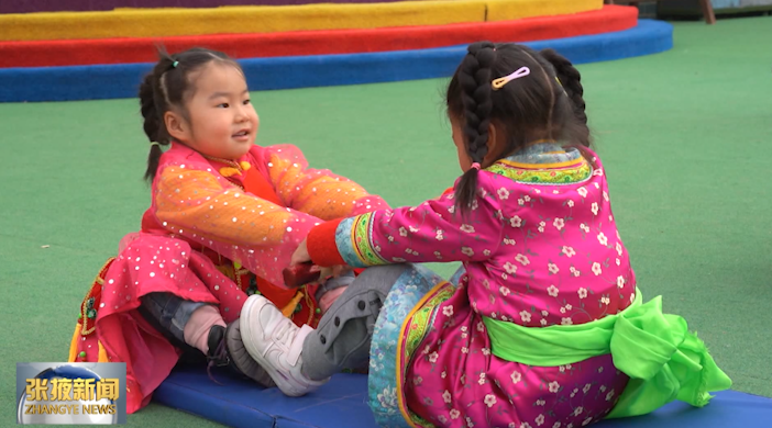 在肃南县康乐幼儿园,老师们精心准备了课件为小朋友介绍裕固族毡帽的特点,孩子们跟着老师学唱裕固儿歌。在户外活动时间,幼儿园把“锅庄”“拔棍” “顶杠子”等独具特色的民间传统体育活动常态化融入到幼儿晨练、户外游戏等活动中。