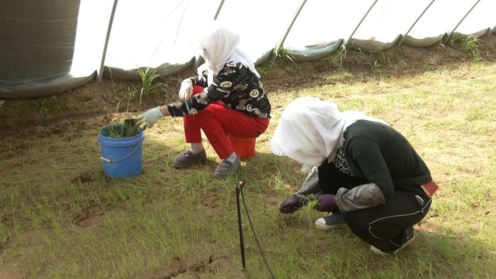 在古浪县五道沟,一座座日光温室大棚在春日暖阳的映照下显得格外耀眼,走进横梁乡春晖新村种植户崔雪娥的温室大棚,热浪扑面而来。崔雪娥正在和几个工人给大棚韭菜除草,精心照料着大棚韭菜。