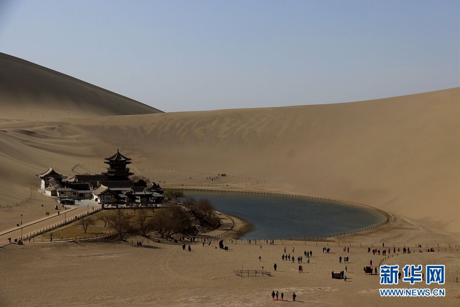 3月25日,游客在甘肃省敦煌市鸣沙山月牙泉景区游览。新华网发 (张晓亮 摄)