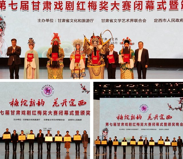 “甘肃戏剧红梅奖”是由省委宣传部批准的全省戏剧类级别最高的专业奖项,对应中国戏剧家协会“中国戏剧梅花奖”,每两年举办一次,已成为发现、选拔和鼓励全省优秀戏剧演员,推动甘肃省戏剧大省建设的重要平台。本次大赛期间,共有来自全省14个市州推选的9台大戏、66部折子戏参与比赛,同时,还有4台大戏参加展演,1台大戏进行祝贺演出。秦腔《七郎八虎闯幽州》、新版儿童剧《大豆谣》、陇剧《大禹治水》、秦腔《豆腐引子》、歌剧《呼儿嘿哟》5部作品荣获优秀剧目奖。秦腔《大坪故事》、音乐剧《焉支花开》荣获剧目奖,陇剧《南梁忠骨》、秦腔《葫芦峪》、秦腔《洮水明珠》荣获优秀展演剧目。甘肃演艺集团、兰州大剧院、定西市文学艺术界联合会、定西文旅体发展有限责任公司、定西铁堂演艺有限公司、甘肃省秦腔艺术剧院、金昌市文学艺术界联合会等单位荣获组织奖。王成林、安拓、李宁、李彦君、李晓晨、李媛媛、杨叶、杨向荣、汪利强、张亮、陈兰兰、苟宝龙、苟菊艳、钟声、徐升、郭一繁、景春艳、蒲建民、漆金喜、谭强荣获第七届甘肃戏剧红梅奖大赛表演奖。