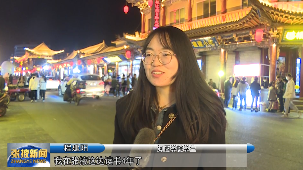河西学院学生 程建阳:“我在张掖这边读书四年了,然后每次天气回暖的时候呢,就会来明清街欣赏这里的美景,还有许多特色小吃,打卡点啥的。”