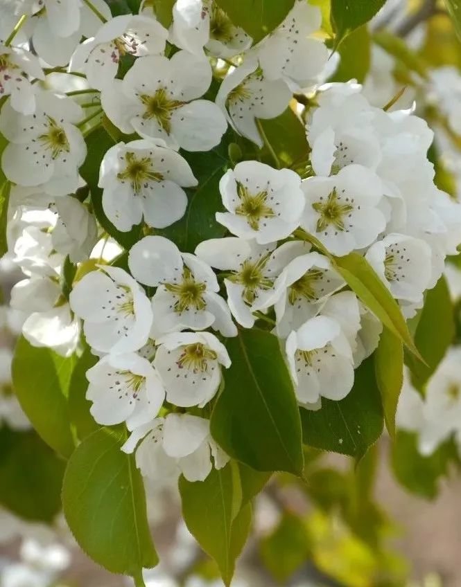 梨花与杏花相比,“版型”大点,梨与杏本来有别,花朵自然大小不一。梨花怒放时,绿叶也挤挤挨挨的,与花朵一起分享春天的喜悦。