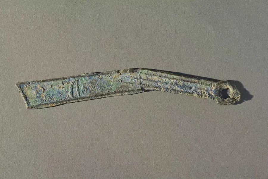 我馆馆藏的战国明刀是磬折明刀的一种,刀身与刀柄连接处为方折,状似古磬缘,又称“方折刀”,刀首较窄,刀刃较钝,刃部已成直线,刀脊弧度小、中断,刀柄直纹深入刀身。长13.7厘米,宽1.5厘米,重30.0克。面文“明”字已固定在面,是“明”的象形文字。燕明刀背文十分繁杂,文字多为记数、记状、记物,或单字、双字、多字;另有记多种符号者,品种超过百余种。有学者分析认为,这些背文可能是区别炉次和钱范次序的一种标志。