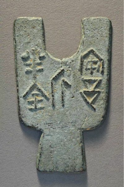 平首布分为尖足布、类方足布、类圆足布、桥足布、方足布、锐角布、圆足布、三孔布、长布。我馆馆藏的战国安邑半釿为战国魏国铸币,圆肩、圆裆、方足,是典型的桥足布。它面背俱有周郭,素背,首、裆部均有裂纹,面文倒书篆书“安邑半釿”,长6.1厘米,宽3.86厘米,重16.14克。“釿”为重量单位,“一釿”约为15克,相当于秦制一两。
