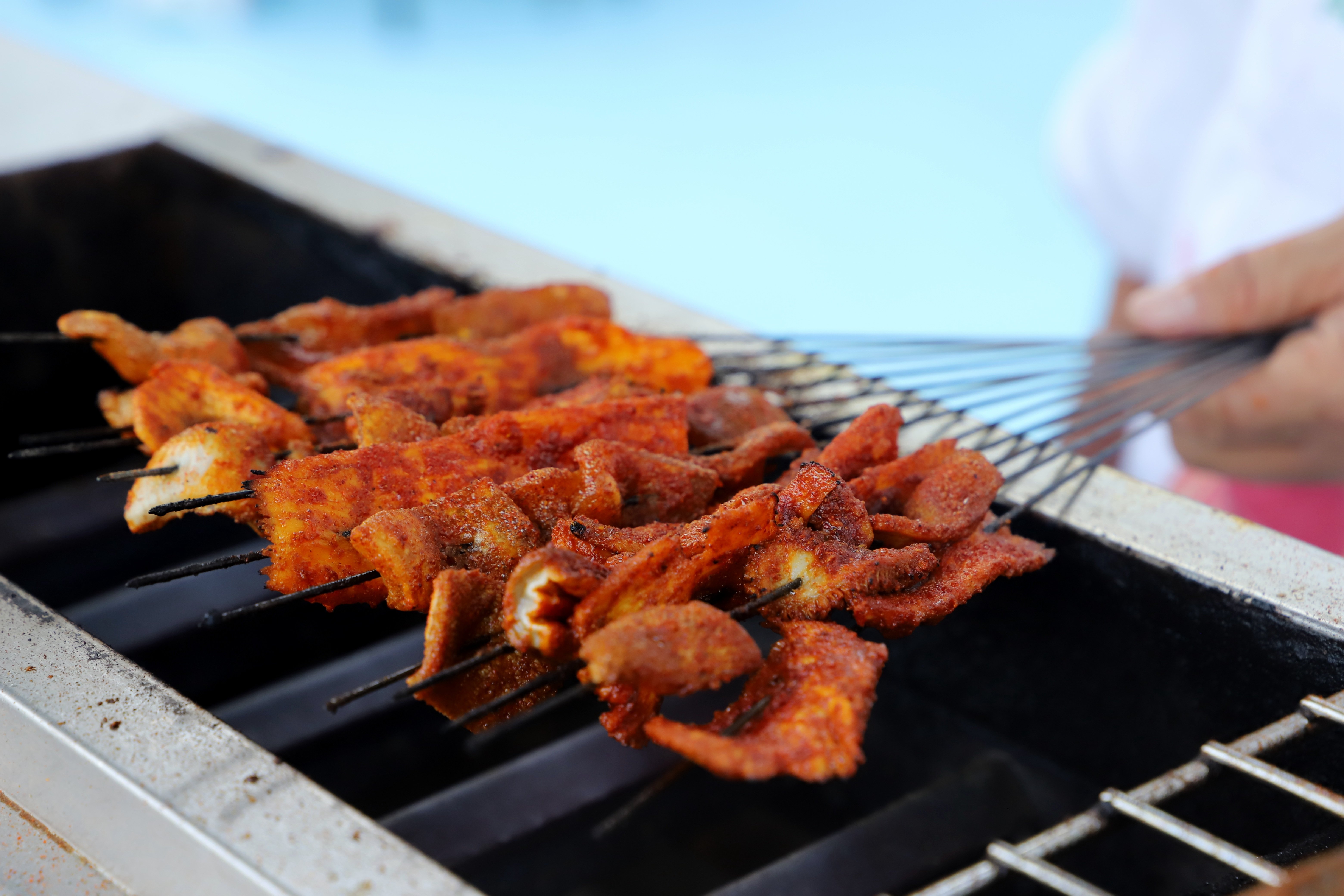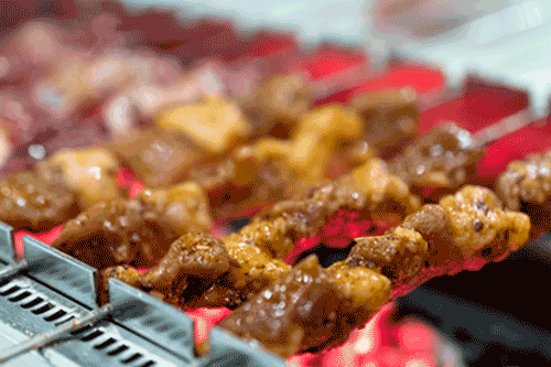 嘉峪关早在魏晋时期就有了烤肉,穿越1600多年的历史,如今依然是一道珍馐美味。新鲜的羊肉,切成拇指大的菱形肉块,串穿在铁钎子上,浸蘸精盐、姜粉、辣椒粉、花椒粉、八角粉等佐料配制的调味品,放到特制的长方形烤炉上用火焙烤,并不断翻动,随时翻撒调味品,烤到表面脆黄,肉质熟透,香味浓烈时即可食用。烤好的羊肉,趁热吃嚼,味美爽口,营养丰富。