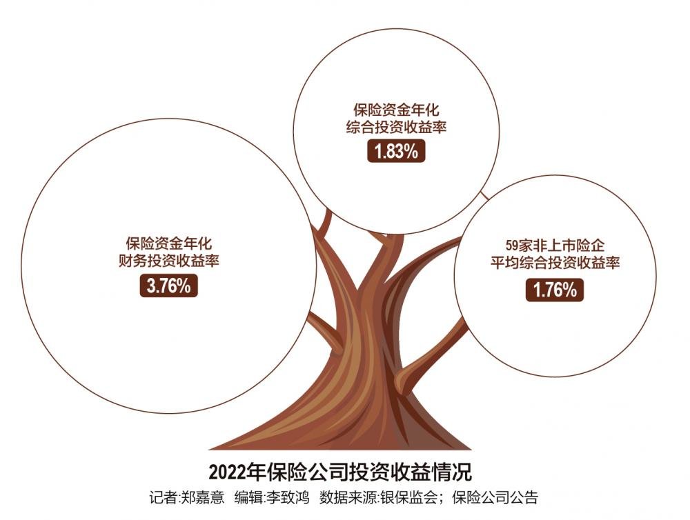 数据显示,2022年,各人身险公司的投资收益率大多不尽如人意。据银保监会披露,2022年,保险资金的年化财务投资收益率为3.76%,年化综合投资收益率为1.83%。据记者不完全统计,59家非上市险企平均综合投资收益率仅达1.76%。