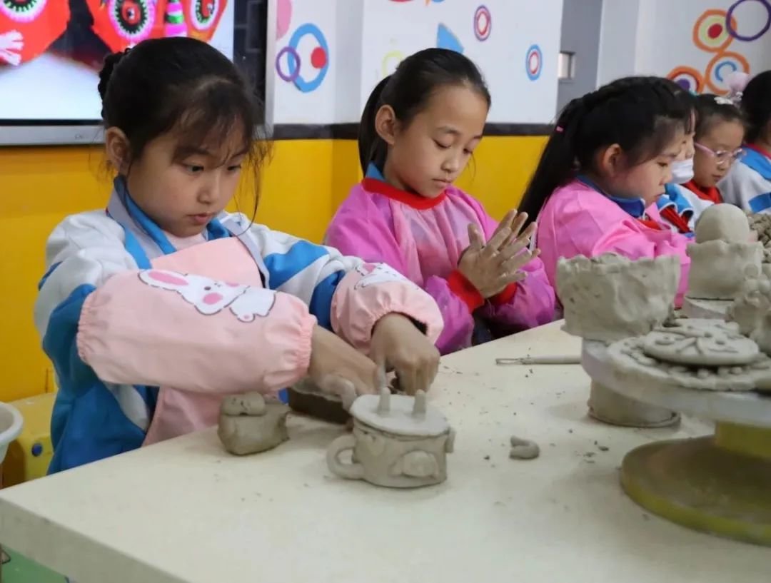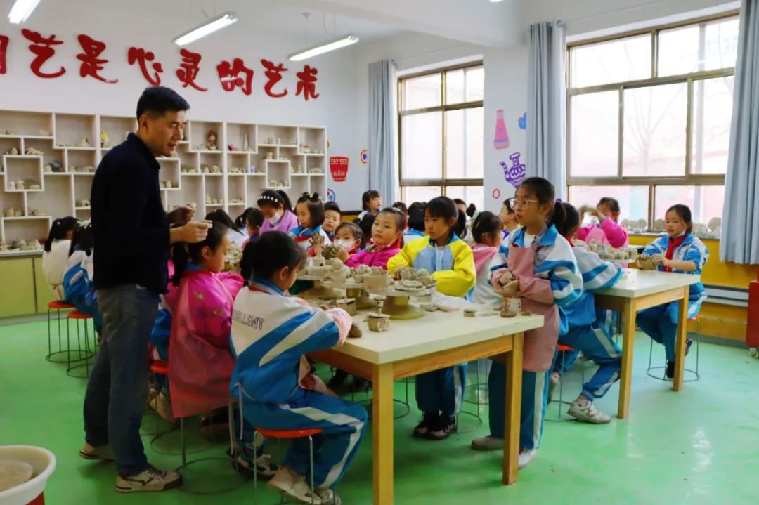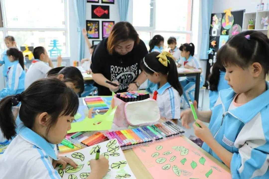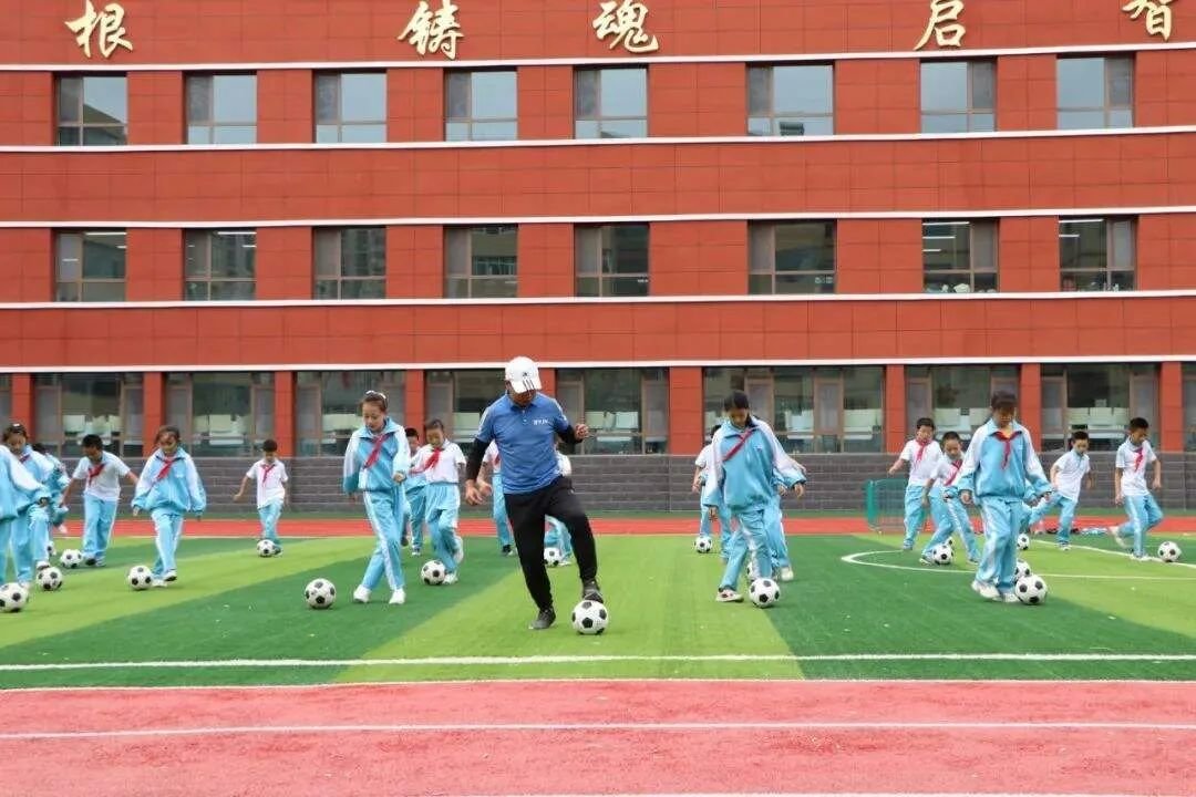 运动场上,学生们进行足球基础动作教学,传球、垫球,一招一式,跟着老师学得有模有样,手工社团内,大家充分发挥想象力和创造力,五颜六色的彩纸在孩子们的手里变成形态各异的许愿星、绿叶等等,用彩笔塑造出了生动活泼的形象。