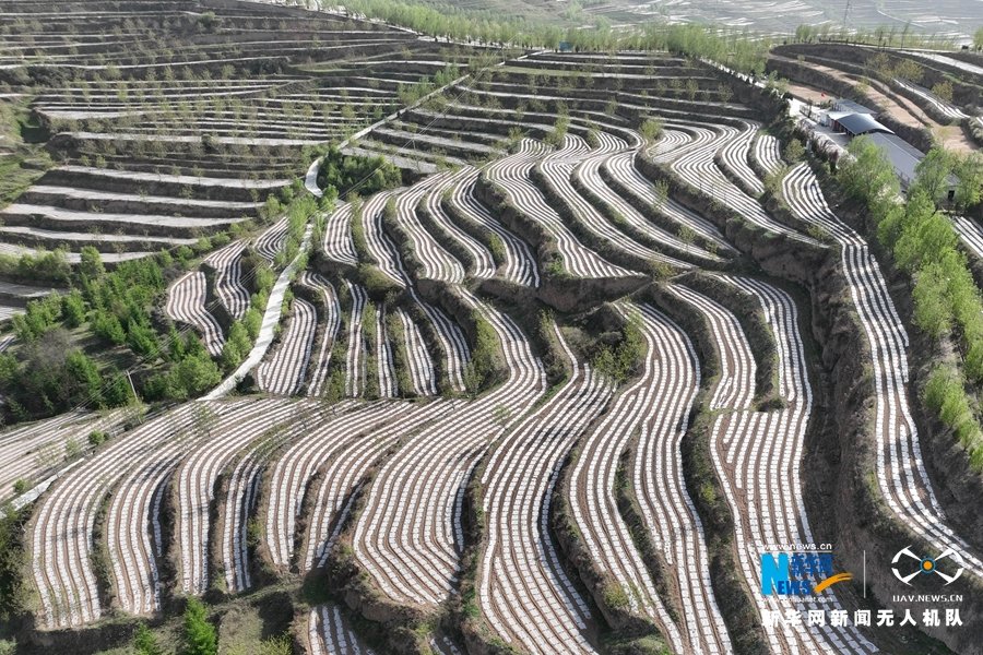 甘肃省陇南市西和县兴隆镇王家梁万亩产业种植基地,千余亩玉米完成地膜覆盖。放眼望去,梯田层层叠叠,一垄垄覆好的地膜随山势蜿蜒,宛如大地“台阶”。(文字:梁云霞)