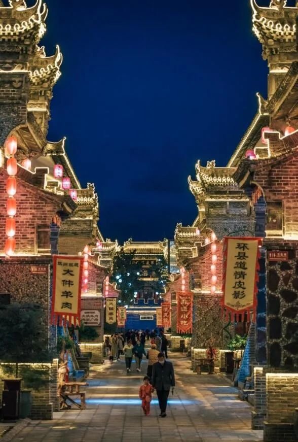 庆城药王洞养生小镇的夜晚五彩斑斓。每当夜幕降临的时候,深蓝色的天空好像蓝色的地毯,点缀着闪闪繁星,让人不由深深地沉醉。柔远河清晰的勾勒出庆城玲珑剔透、凹凸有致的线条,两岸变成了灯的海洋,光的世界,以药王洞养生小镇为中心的灯饰像两条长长的火龙伸向南北方。