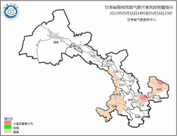 另外,甘肃省气象服务中心于今天上午10时30分发布甘肃省输电线路强对流气象灾害风险预警。预计今天下午到夜间,我省甘南、庆阳两州市及武威(天祝藏族自治县)、兰州(永登县、红古区)、临夏(永靖县、积石山、临夏县)、白银(会宁县)、定西(通渭县)、天水(秦安县、清水县、张家川)、平凉(庄浪县、华亭市、崆峒区)将有雷暴;其中,白银(会宁县)、定西(通渭县)、平凉(庄浪县)、天水(秦安县、张家川)、庆阳(环县、华池县)将有雷暴大风或冰雹,主要发生时段为14至23时。对输电线路有一定影响,请注意防范!