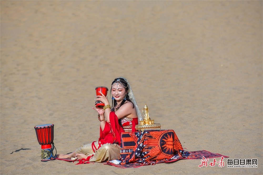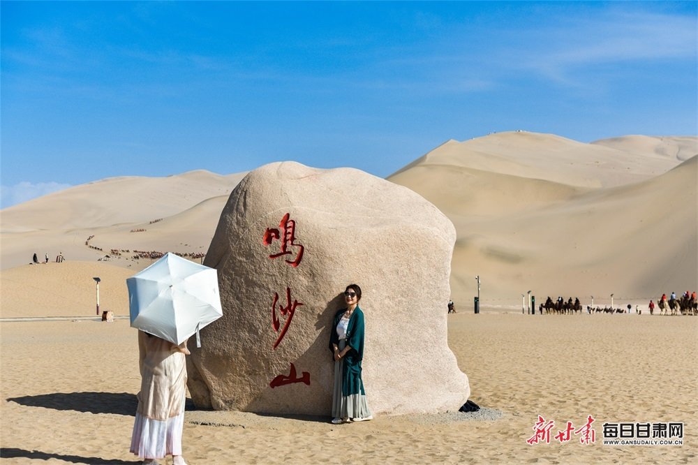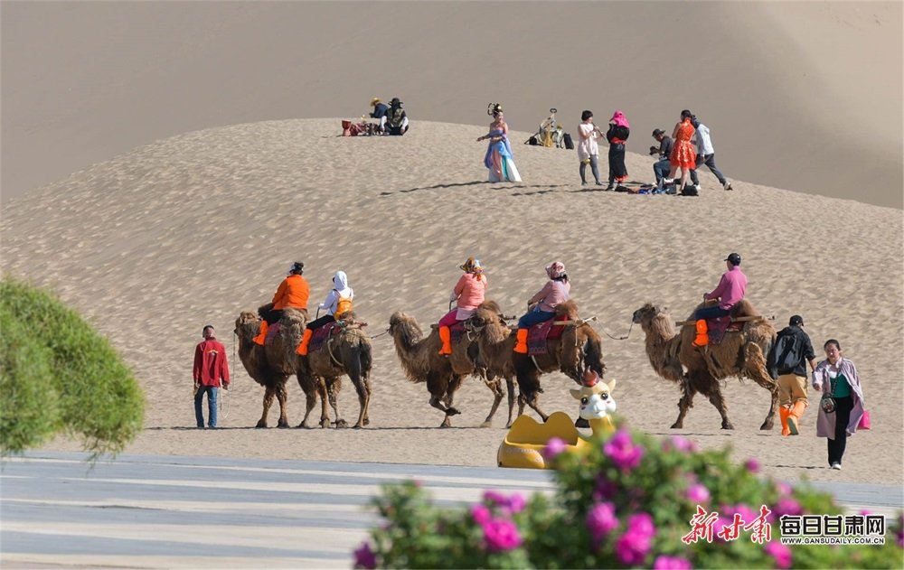 初夏,丝绸之路国际文化旅游名城敦煌气温升高,处处花红柳绿,美丽迷人的大漠风光吸引大批游客前来观光游览。