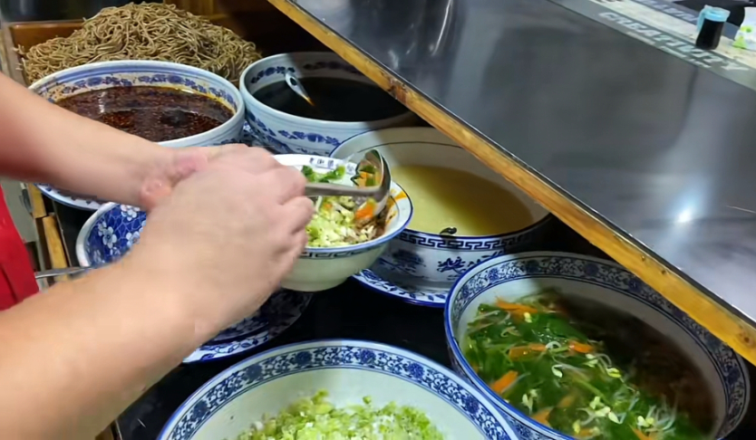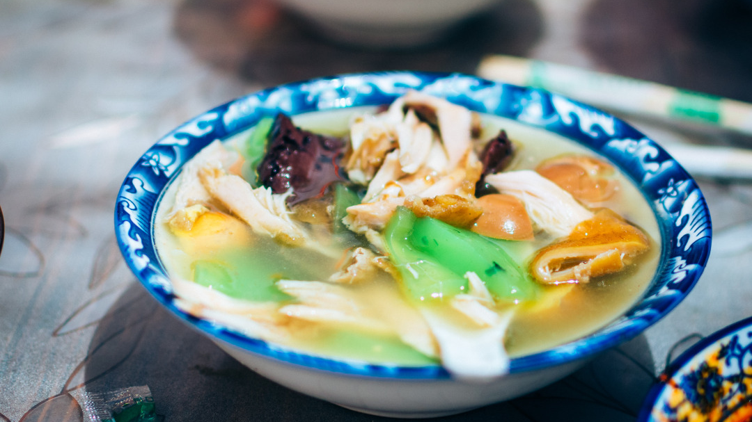 菠菜汁让普通白粉变翡翠,浓郁的鸡汤打底,再加上卤蛋和入味的烧鸡,这道陇西人的夜宵说是晚饭也不足为过。