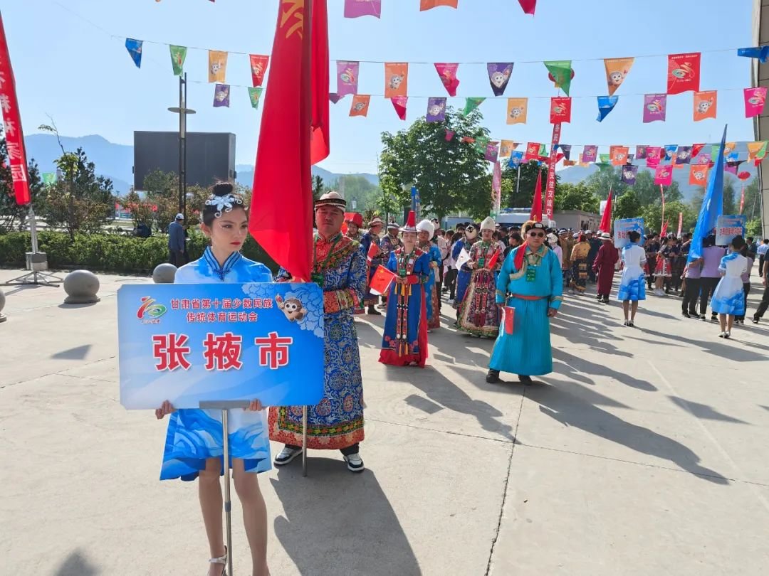 开幕式上,张掖市体育健儿们身着民族传统服饰,精神抖擞、意气风发,在入场式上进行了《裕固姑娘》驻停表演,他们以饱满的精神状态展现出了张掖市各民族儿女团结一心、共创美好未来的精神风貌。参赛选手们表示,将充分发扬“团结友爱、奋发向上”的体育精神,努力拼搏,取得好成绩。