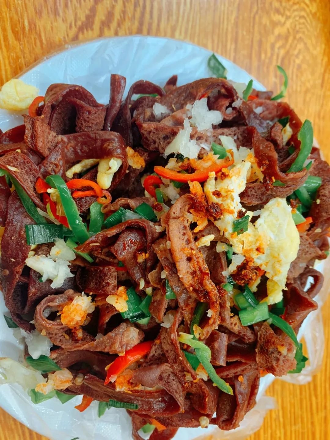 在靖远县的乡村,每到腊月杀了年猪之后做猪血面条,宴请亲朋好友、邻里乡亲,已经成了一个流传已久的乡俗,炒血面也就成了一道人人爱吃的农家美食。