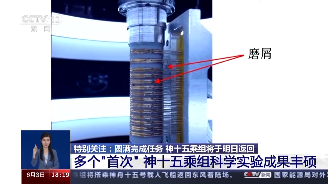 今年5月,三名航天员还对导电环磨屑产生过程和团簇现象首次实现了在轨观测,这对后续改进各类航天器的空间导电环产品设计、保证航天器在轨可靠稳定运行奠定了良好基础。