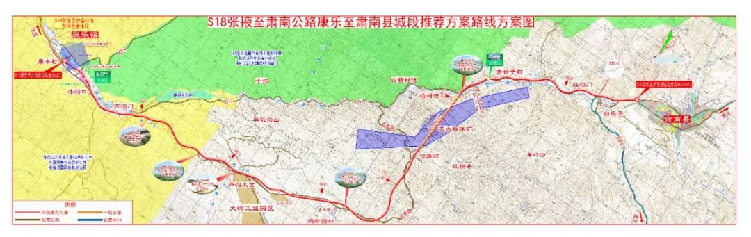 S18张掖至肃南公路是《甘肃省省道网规划》中的省级高速联络线,是张掖市通往少数民族自治县——肃南县的高等级公路。项目起于肃南县康乐镇,与S18张肃一级公路张掖至康乐段顺接,沿梨园河逆流方向布设,途经孟家庄、芦沟门、碱泉子,设隧道穿越灰达坂山至榆树湾,进入隆畅河河谷,经青台子、隆丰村,终点止于肃南县城,全长34.55公里,拟按80公里/小时的一级公路技术标准建设,估算总投资31.75亿元。