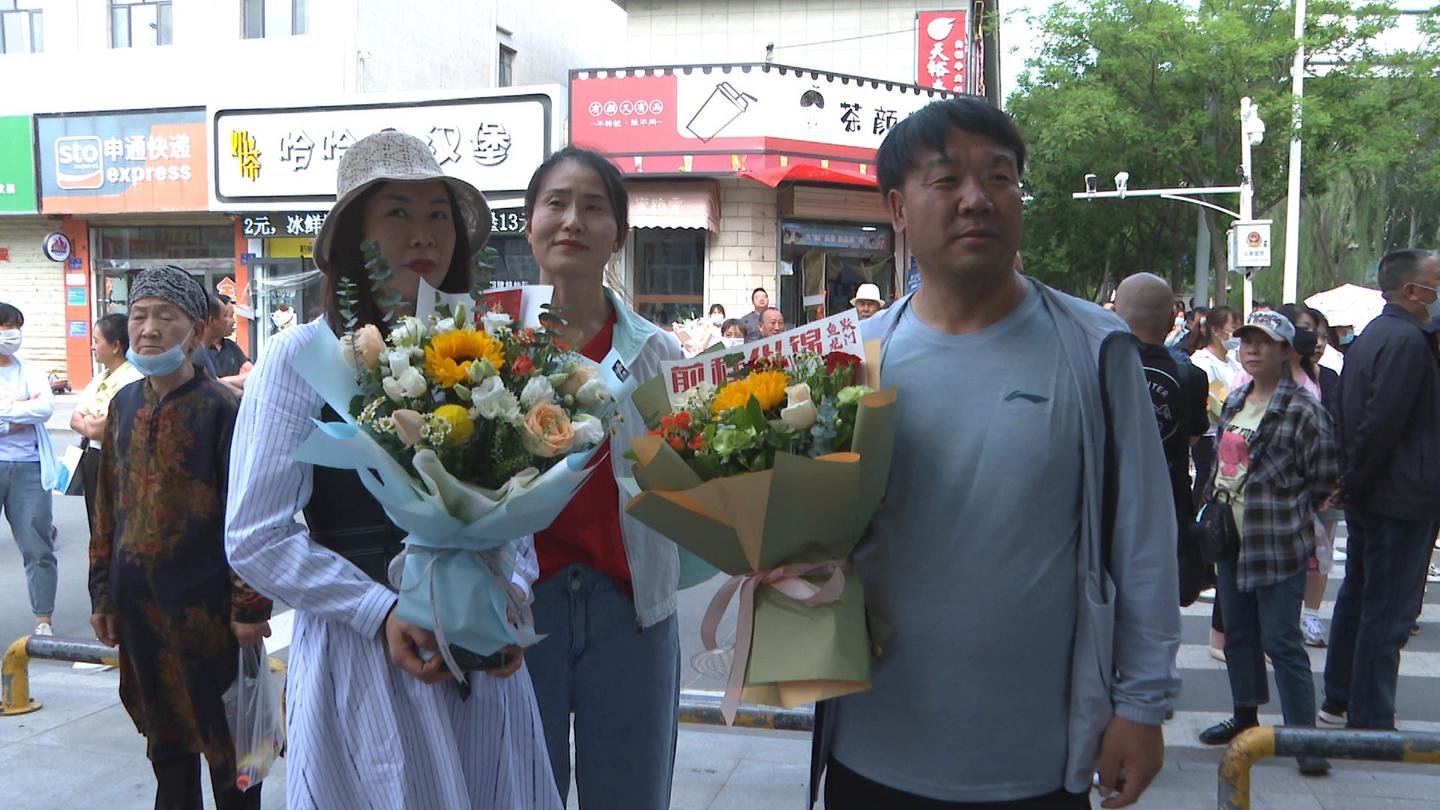 在这样一个特殊的时刻,考生家长及亲朋好友们手捧一束束鲜花,也成为一道独特的风景。