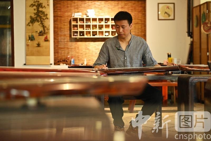 6月10日,文化和自然遗产日当天,甘肃省天水市秦州区梓桐琴馆内,天水古琴制作技艺传承人张涛用自己制作的古琴进行演奏。张涛遵循师父辈“制琴杜绝化学漆”的原则,沿袭古法采用中国传统大漆加以天水雕漆的髹漆技艺手工制琴。天水古琴制作技艺于2017年被列入第四批甘肃省非物质文化遗产代表性项目名录。中新社记者 李亚龙 摄