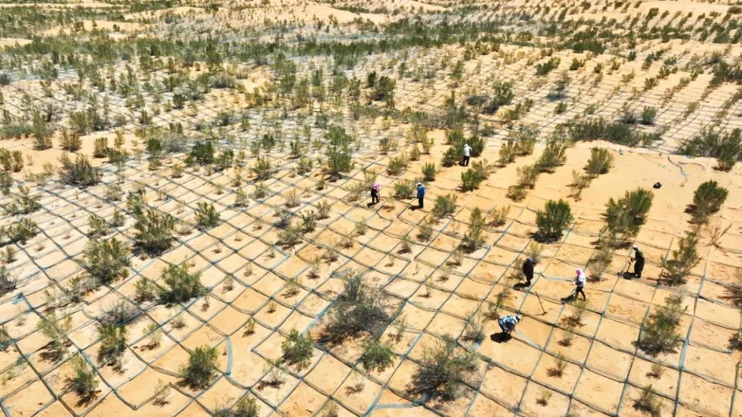 连日来,在张掖市临泽、高台北部荒漠区防沙治沙区,干部群众共同压沙障、栽梭梭、浇水管护、筑牢“阻沙网”,塑紧“防沙衣”……周边连绵起伏的沙漠上,麦草方格沙障一望无际,栽植的梭梭等植物迎风挺立,焕发蓬勃生机。
