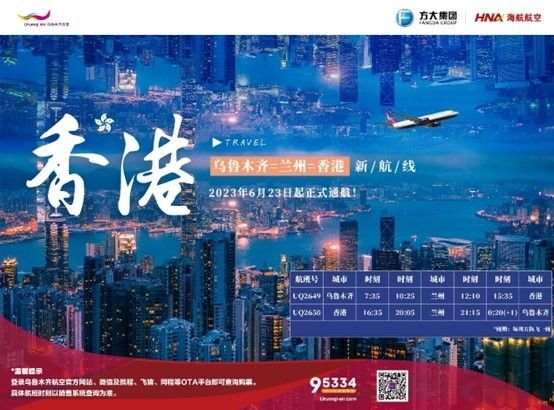 乌鲁木齐航空有限责任公司消息,乌鲁木齐航空将于6月23日起开通乌鲁木齐-兰州-香港新航线,加密乌鲁木齐飞往香港航班至每周两班。