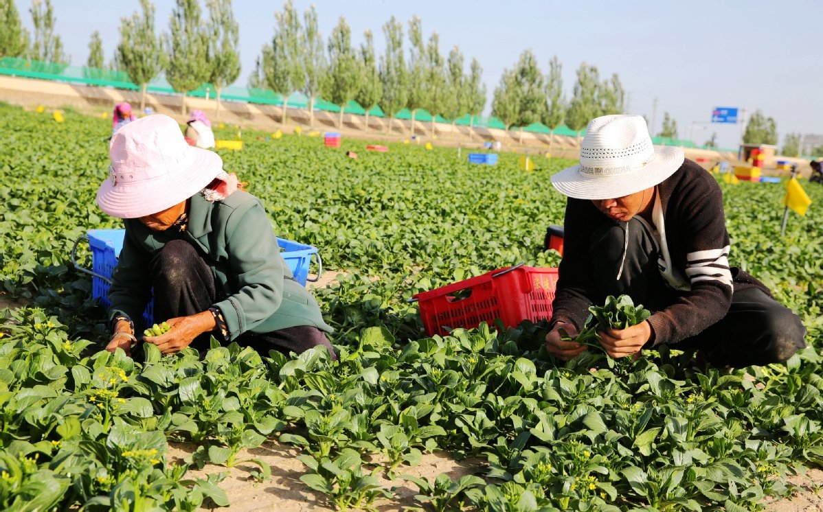6月18日,在甘肃省张掖市甘州区乌江镇的供粤港澳蔬菜基地上,菜农们头顶烈日采摘菜心,准备分拣、包装后发往粤港澳地区,田间地头一派忙碌的场面。