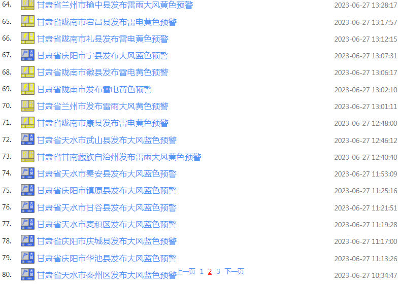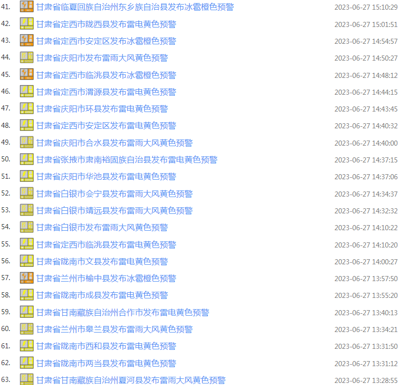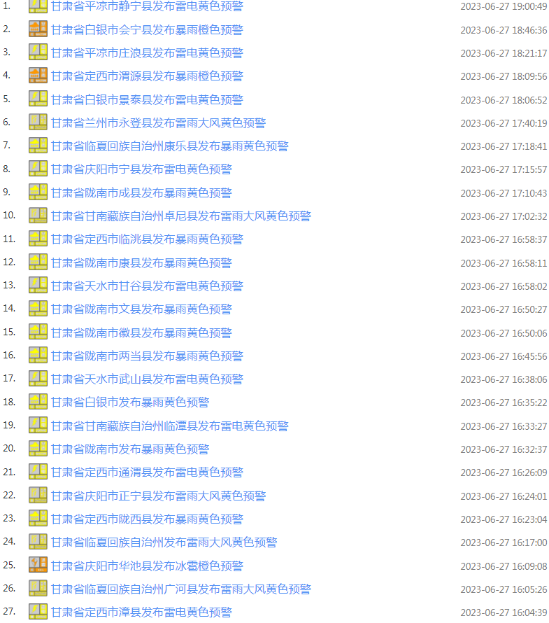 甘肃省气象局、甘肃省交通运输厅、甘肃省公安厅交通管理局6月27日10时联合发布甘肃省高速公路强对流天气预警: