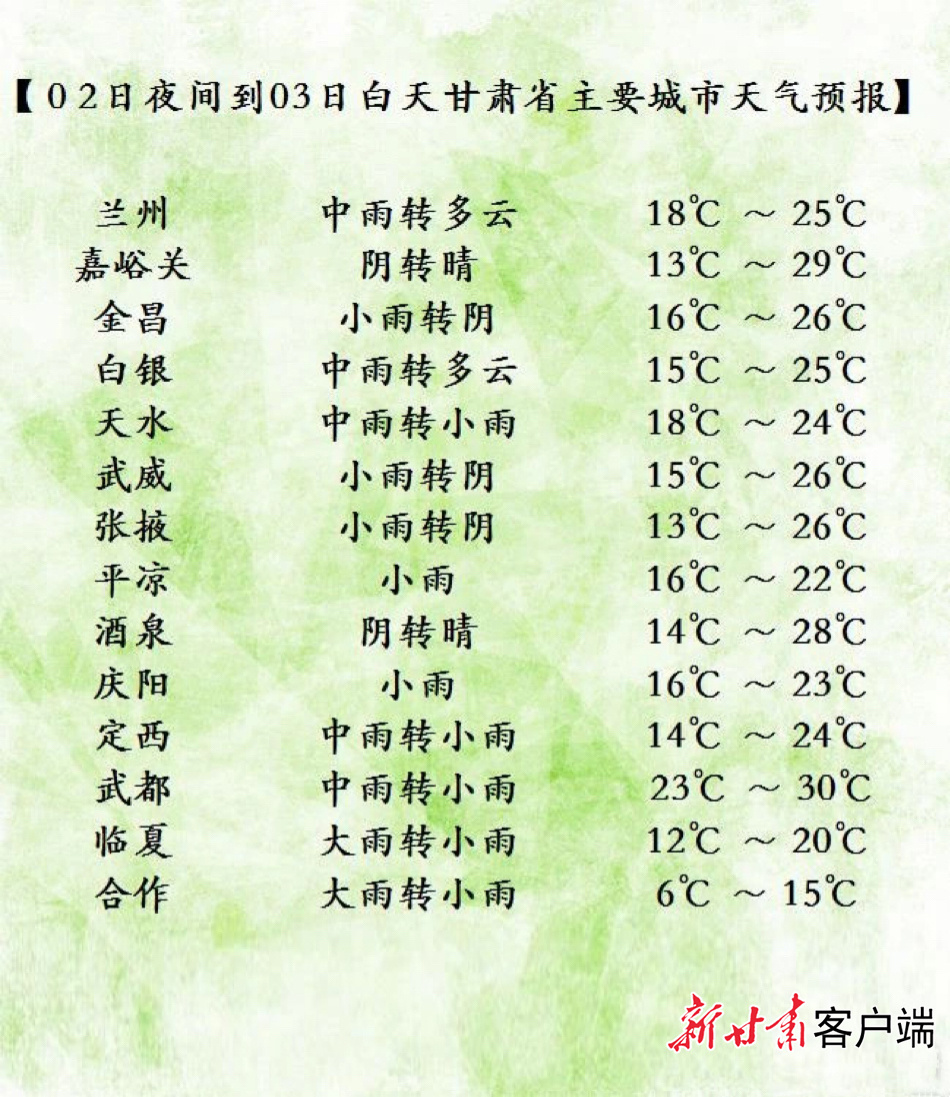 另据气象预报显示,7月2日夜间到7月3日白天,酒泉、嘉峪关两市晴间多云;张掖、金昌、武威三市多云,部分地方阴有阵雨或小雨;省内其余地方阴有小到中雨。