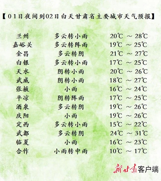 气象预报显示,7月1日夜间到7月2日白天,张掖、甘南、临夏、定西等市州阴有小雨,局部地方有中雨;兰州、白银、陇南、天水、平凉等市多云转阴有小雨或阵雨;省内其余地方多云,部分地方阴有阵雨或雷阵雨。