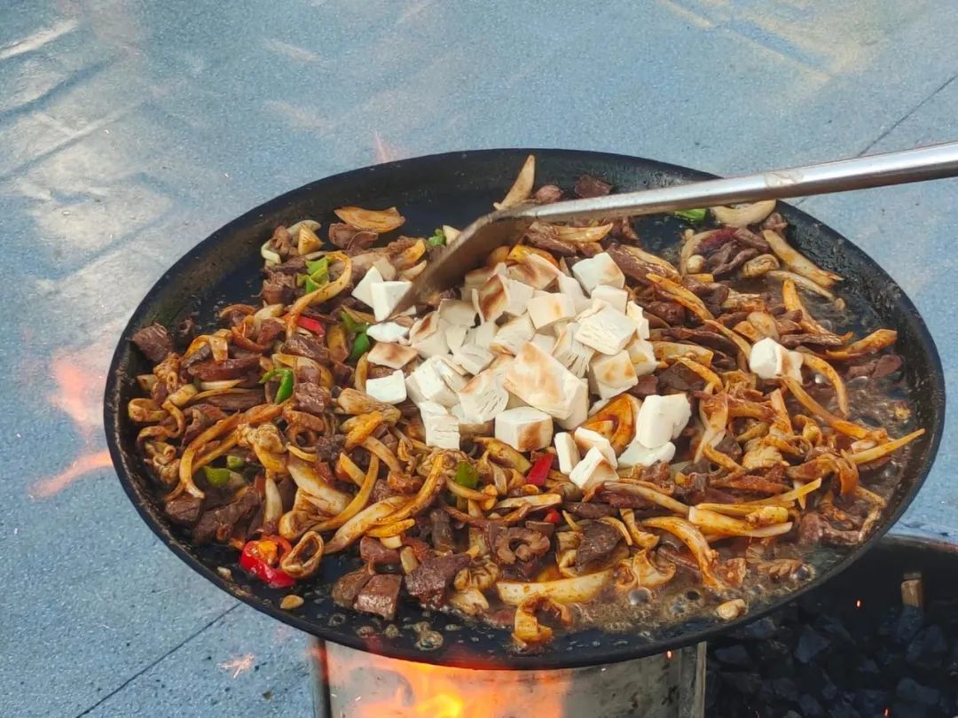 这是一幕烟火与美味的共舞。“炉火照天地,氤氲生紫烟”。大厨们先是将半勺动物油脂均匀的抹在鏊子上,待油脂融化后放葱姜辣椒爆香,然后切好的羊肝、肺、肚、肠、心放在鏊子上大火爆炒,在烟火气的加持下,没过几分钟,香喷喷的炒拨拉便炒好了,大厨将菜用炒勺拨拉成几份,分在鏊子的每个人前,大家便你争我抢地吃起来了。“每一口都在刺激我的味蕾,此味只应天上有,人间能得几回尝。夜幕降临,三五个朋友出去散步,围坐火炉,来一份炒拨拉,边聊边吃,不够再加,实为一种生活的享受。”河西学院教师王欢告诉记者。