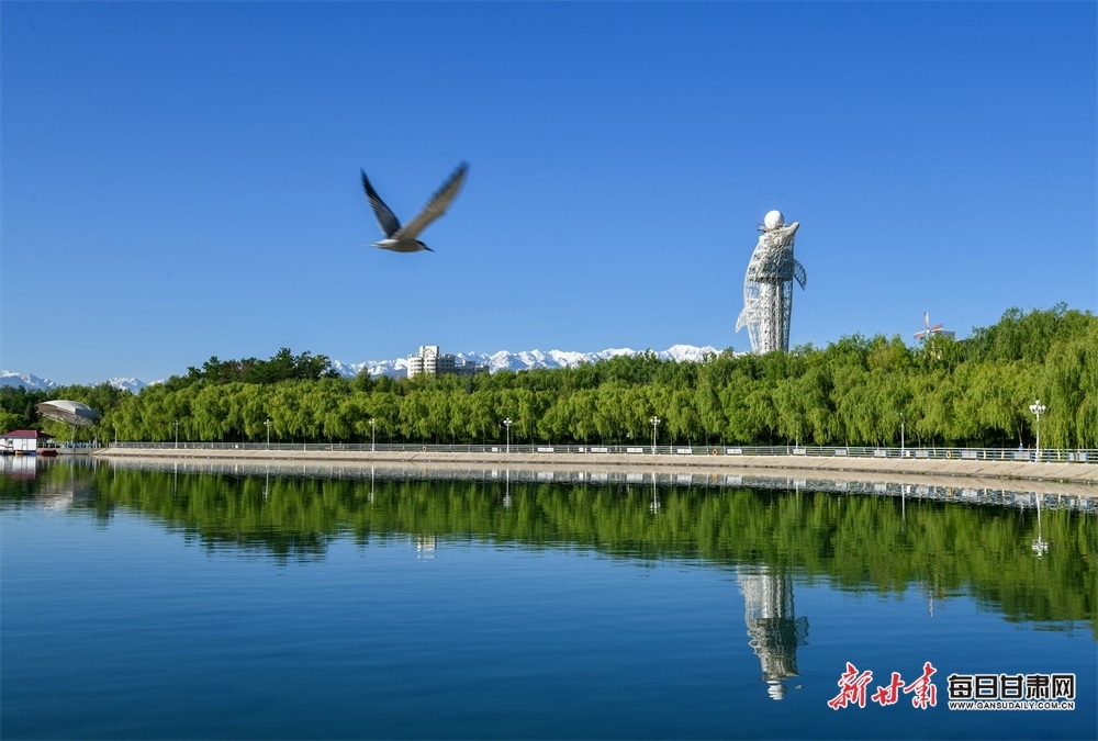 7月3日,受降水影响,祁连山顶被白雪覆盖,雨后凉爽的空气扫尽了盛夏的闷热,也将城市冲刷得愈加翠绿。在皑皑白雪的映衬下,嘉峪关关城显得更加雄伟、艳丽,东湖生态旅游景区花红柳绿、碧波荡漾,鸟儿在空中飞舞,市民在湖边快乐健身,将戈壁深处的嘉峪关市装扮成一幅灵动的水彩画。