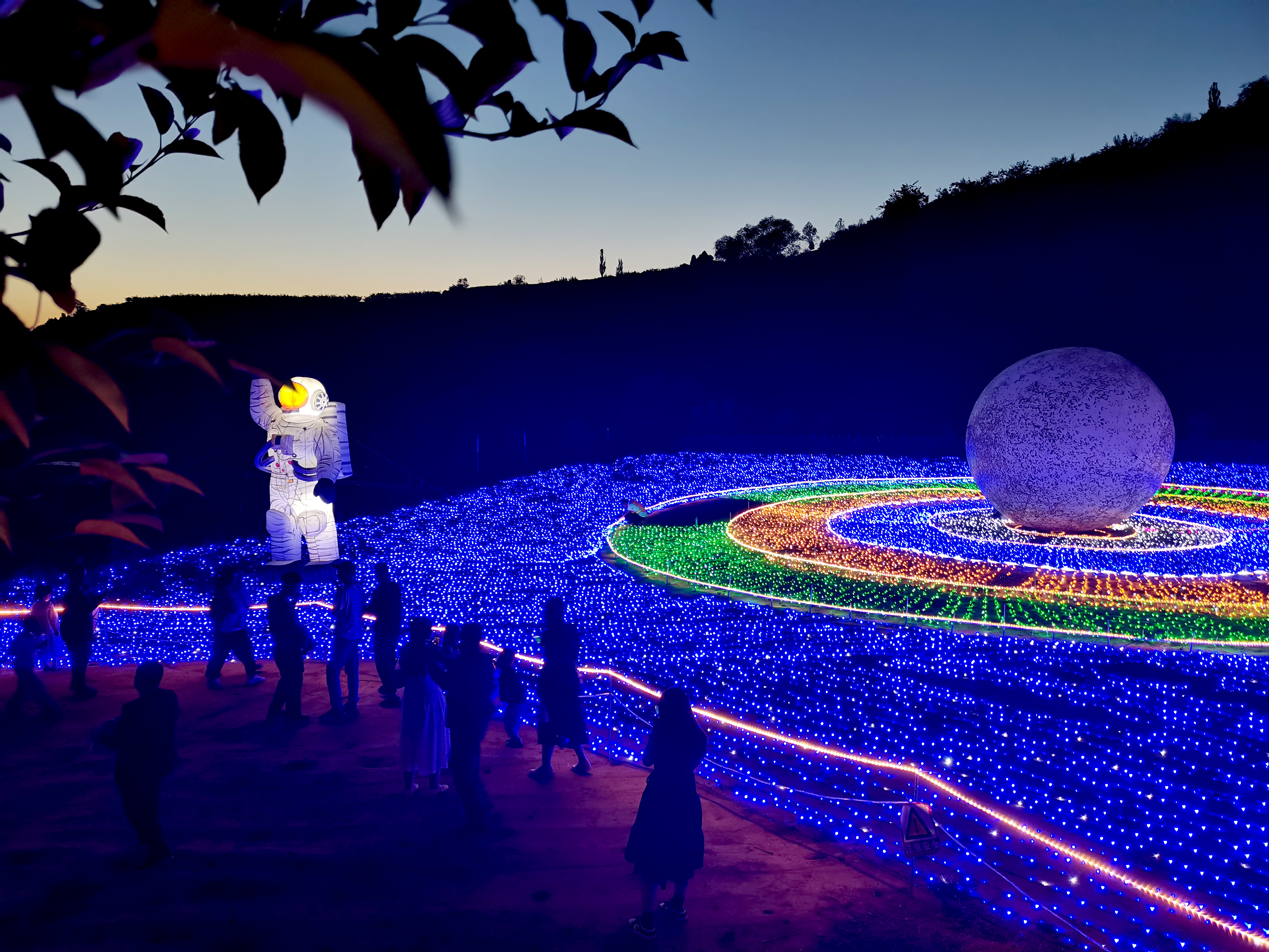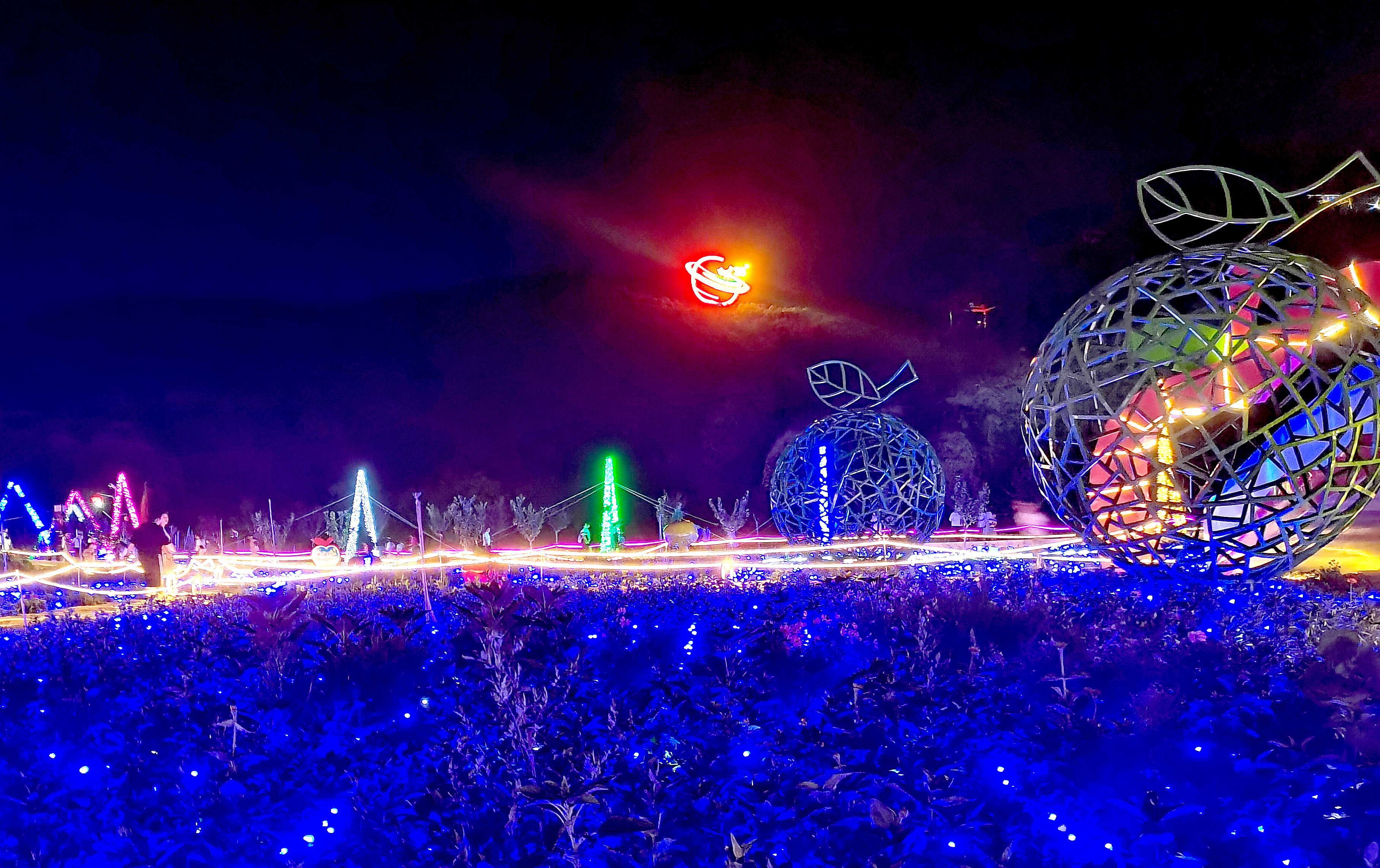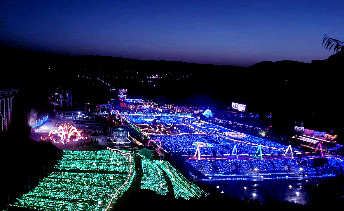 置身于苹果谷景区,仿佛进入一个五光十色的光影世界。从高空俯瞰,整个景区灯火辉煌,让游客沉浸在梦幻多姿的奇幻世界中。