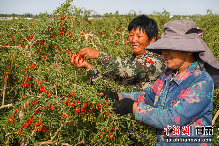 枸杞地里,枸杞树苗枝繁叶茂,翡翠般的绿叶簇拥着一串串玛瑙似的红果,百余名劳务工人穿梭在田间地头,熟练地采摘成熟的枸杞。昼夜温差大、日照时间长,这让玉门成了种植生产枸杞的绝佳区域,一颗颗皮薄、籽少、肉厚、汁多的枸杞,为种植户们带来了可观的收益。
