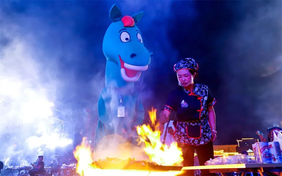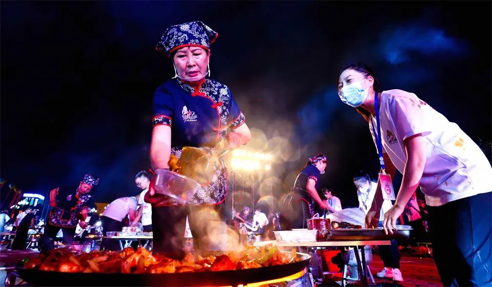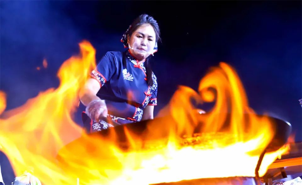 第一轮、第二轮、第三轮百人百锅炒拨火爆进行,现场火光升腾,香气四溢,人们在共品这流传千年美食的同时,还观赏了鼓声震天、舞姿翩迁的文艺表演以及新颖独特的无人机星空展演秀。
