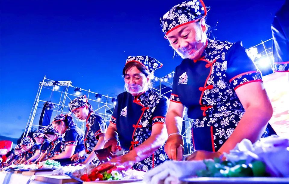 随着舞蹈《焉支姑娘》的唯美表演,美食节拉开序幕,三轮百人百锅炒拨拉烹饪技艺展演“火爆”呈现:100个鼓风机、铁鏊、方桌整齐排列,构成了巨大的“锅阵”;100名炒拨拉炒制“大师”静坐在锅前“蓄势待发”。随着主持人倒计时口令发出,切配师傅们迅速开始了第一道工序——切配,将最新鲜的食材整齐摆放在砧板上,以娴熟的技艺、精湛的刀法,将食材切成块、片、条、丝,不同形状颜色的牛羊杂,再搭配紫色的洋葱、绿色红色的辣椒、白色的蒜姜和白绿相间的葱段,分类摆盘。炒制师傅们将各色食材分类分段放入铁鏊周圈,中心留出空间烧油,一切准备就绪。“撒料、起锅、烧油!”主持人一声令下,百名炒制师傅们点火、鼓风,挥动长柄勺不停在鏊上翻炒,锅中翻腾的炒拨拉犹如一朵朵颜色各异的花朵争先绽放。