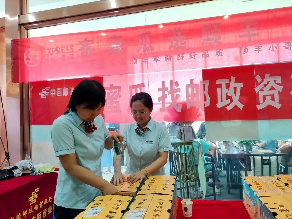 在蜜瓜枸杞展销会现场,邮政快递工作人员正为瓜农提供揽收、封装、运输“一条龙”服务;组织网运车辆进行蜜瓜专车运输,当日到达邮件处理中心后马上处理,缩短运输处理时限,提高运输效率。
