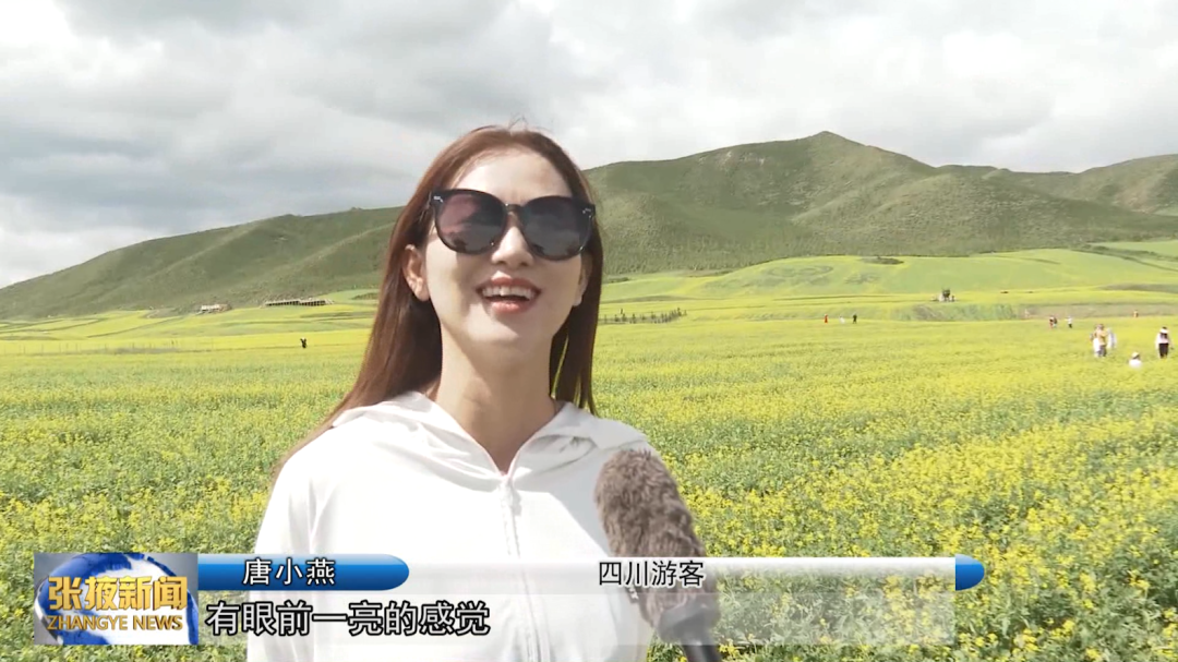 四川游客 唐小燕:“看到这里的风光太美好了,让我眼前一亮,这边非常漂亮,有美丽的油菜花、宽阔的大草原,都是我们那边没有的,空气非常好,让人有很放松的感觉。”
