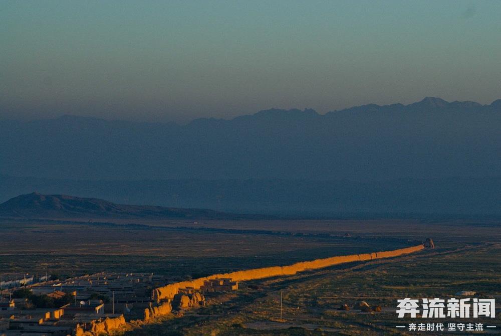 祁连山下,甘肃山丹汉明长城犹如一条巨龙蜿蜒盘旋在漫漫戈壁。