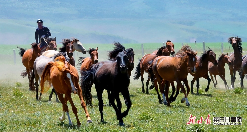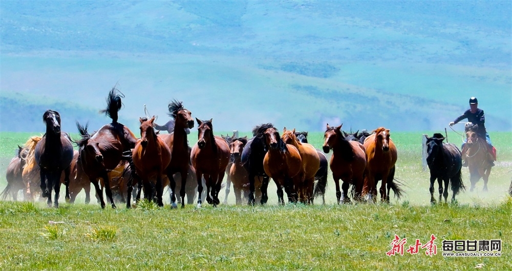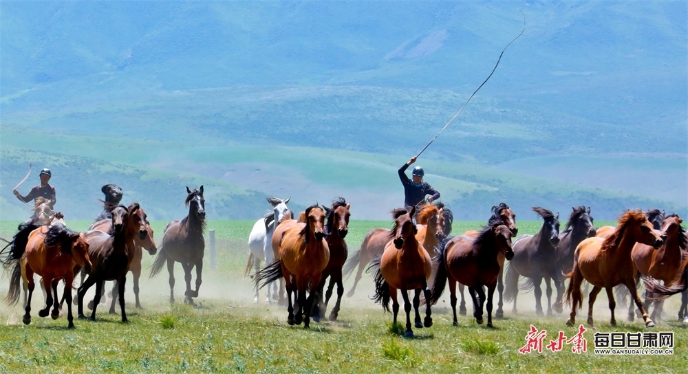 7月25日,位于祁连山北麓的张掖市山丹马场草原绿草如茵,牧马人放牧途中,奔跑的马群再现骏马奔腾美景,吸引了众多游客驻足观赏。