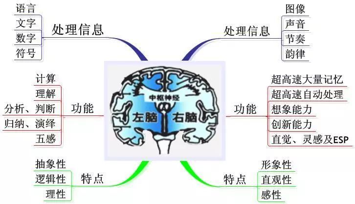 科学家们早已发现,人的左脑主要从事逻辑性、条理性的思维;右脑主要从事形象思维,是创造力的源泉,是艺术和经验学习的中枢,人的专注力和记忆活动同时使用了左脑和右脑的能力。