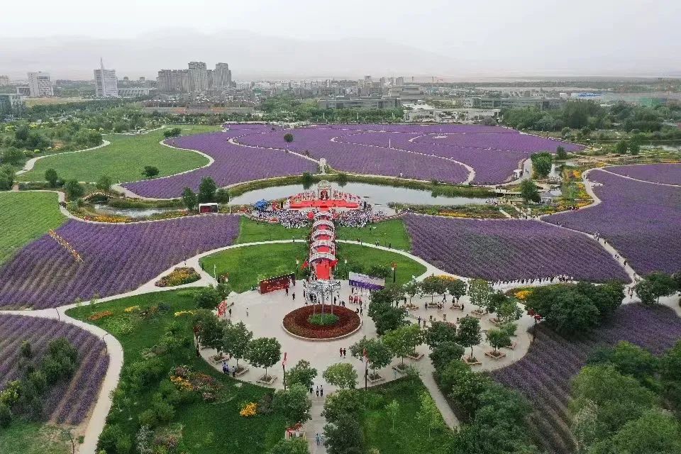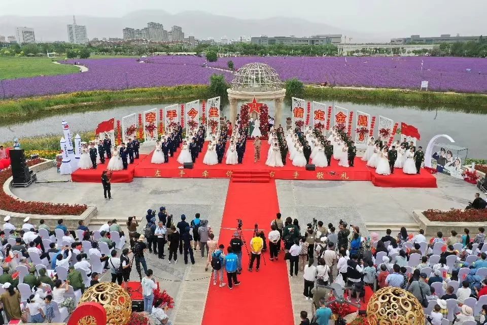 盛夏的紫金苑景区,花开成海,紫浪涌动,芬芳馥郁。“八一”建军节来临之际,金昌市第六届薰衣草之约集体婚礼——“牵手今生·情定金昌”“橄榄绿 火焰蓝”专场在金昌紫金苑景区举行。来自省内外的52对夫妇挽着各自的另一半,依次走过花海,携手穿过爱情长廊,步入婚礼广场,在现场数百位观众的祝福和见证下,共同许下爱的诺言。