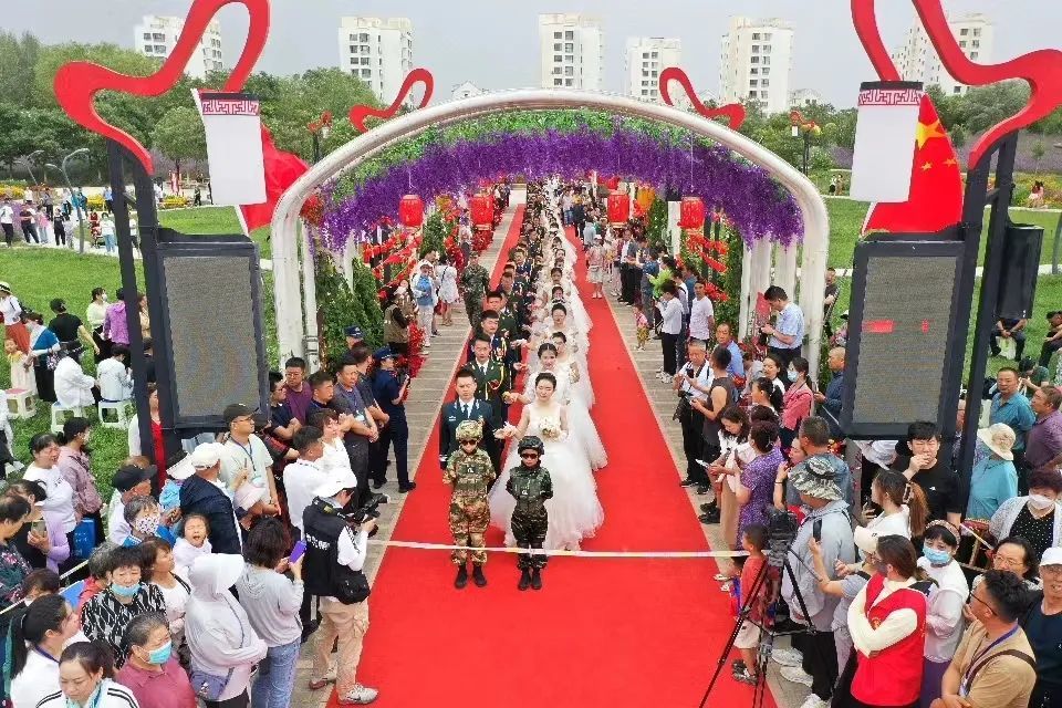 “薰衣草之约”集体婚礼是金昌市文化旅游融合发展的一个品牌项目、名片工程。据了解,本届集体婚礼将举行4场,集中在6月至8月进行,第4场“相约盛夏·浪漫起航”专场将于8月18日举行,活动将进一步引领婚恋新风尚。金昌是全国、全省双拥模范城市,荣获全省双拥模范城“九连冠”,拥军优属是这座城市的光荣传统。当天,全市的拥军模范代表、非遗传承人向新人赠送了剪纸相框和特产。